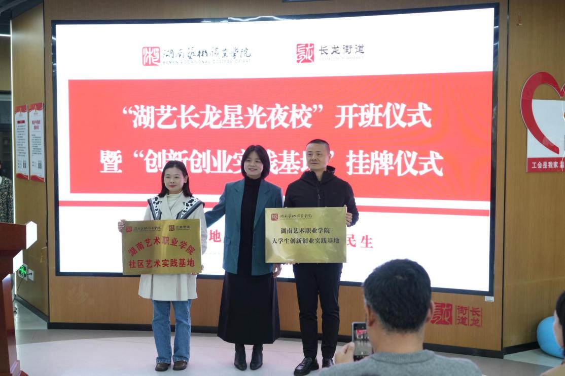 11月10日,学校在长沙县工会驿站长龙站举行“湖艺长龙星光夜校”和“新利指定网站官网网页版入口长龙街道大学生创新创业实践基地”授牌仪式。基地的授牌标志着学校在构建校地协同、产教融合的创新创业实践平台上迈出了更坚实的步伐。党委书记李越胜,党委委员、副校长石洋及新利Lucky官网与创新创业指导处、艺术培训部相关负责人出席了仪式。