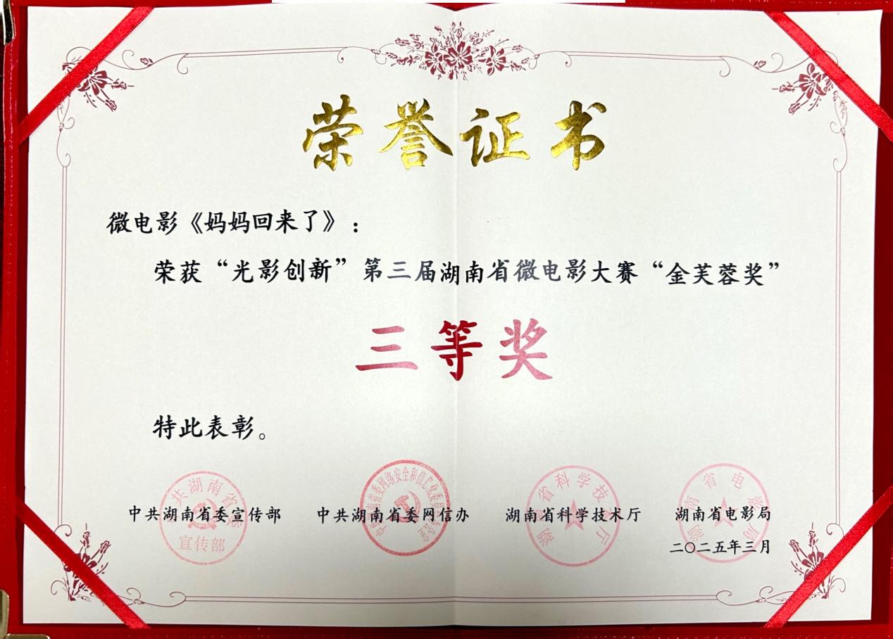 由新利指定网站官网网页版入口数字产业学院曹琰老师执导的微电影《时光动物园》获评本次赛事“金芙蓉奖”二等奖,由马千里、陈德睿老师指导学生创作的微电影《妈妈回来了》《一跃而生》分别获评本次赛事“金芙蓉奖”三等奖和优秀作品奖。