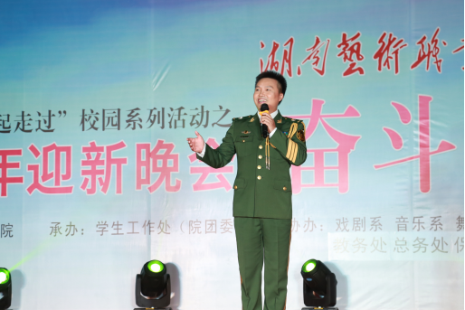 学院特聘教授、武警湖南省总队文工团团长、国家一级演员、青年男高音歌唱家袁双洋作为特邀嘉宾,为在场的同学们演唱了《小白杨》和《向着太阳唱山歌》,他真挚的情感和精湛的唱功博得了在座师生的满堂喝彩。